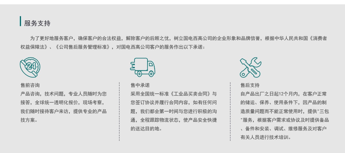 自產(chǎn)品出廠之日起12個月內(nèi),在客戶正常 的儲運、保養(yǎng)、使用條件下,因產(chǎn)品的制 造質量問題而不能正常使用時,提供"三包 "服務,根據(jù)客戶需求或協(xié)議及時提供備品 、備件和安裝、調試、維修服務及對客戶 有關人員進行技術培訓。