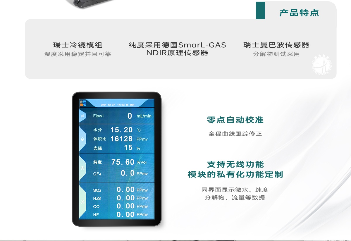 GDSF-411PPD? SF6氣體綜合分析儀是集SF6濕度、SF6純度測試以及SF6氣體分解物測試于一體,一次現場測量,即可完成所有指標檢測,大大節省了設備中的氣體,同時減少用戶的工作量,提高了工作效率。GDSF-411PPD? SF6氣體綜合分析儀采用了國外最優秀的傳感器;濕度采用穩定并且可靠的瑞士冷鏡模組、純度采用德國Smart-GAS NDIR原理傳感器,分解物測試采用瑞士曼巴波傳感器。彩色液晶顯示,實時顯示各種參數,全程傻瓜式的操作,內置充電電池,交直流兩用。