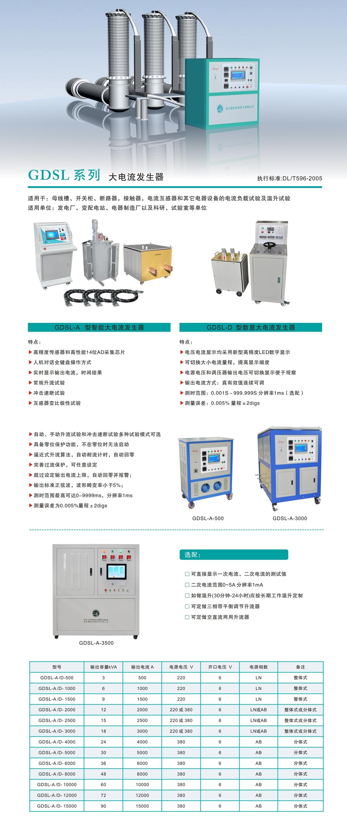 GDSL-D系列數(shù)顯大電流發(fā)生器是國(guó)電西高在GDSL-M型大電流發(fā)生器的基礎(chǔ)上,根據(jù)國(guó)家最新電力行業(yè)標(biāo)準(zhǔn)而設(shè)計(jì)的、性能先進(jìn)的升流設(shè)備。大電流發(fā)生器(升流器)是各行各業(yè)在電氣調(diào)試中需要大電流場(chǎng)所的必需設(shè)備,應(yīng)用于發(fā)電廠、變配電站、電器制造廠及科研、試驗(yàn)室等單位,屬于短時(shí)或斷續(xù)工作制,它具有體積小、重量輕、性能好,使用維修方便等特點(diǎn)。主要用于一次母線保護(hù)及各種電流互感器,電動(dòng)機(jī)保護(hù)器,空氣開關(guān),開關(guān)柜,斷路器,保護(hù)屏等校驗(yàn)。