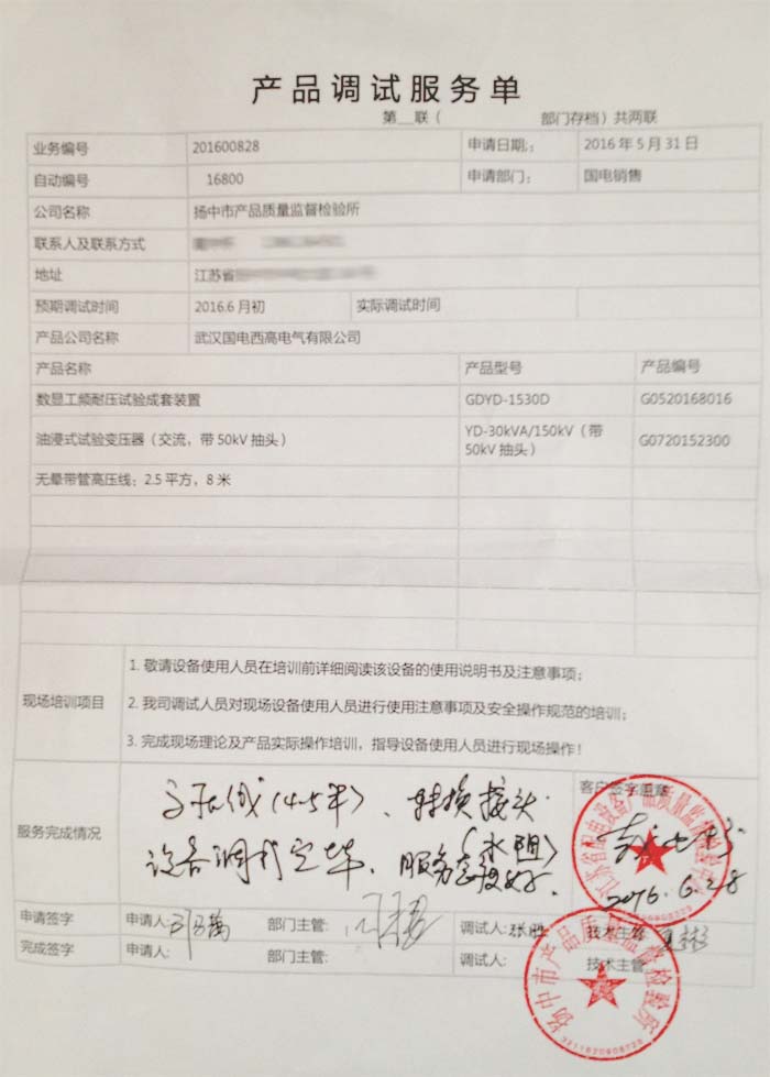 六月,我公司技術部接到江蘇揚中質檢所的調試邀請。在6月27日安排兩名技術工程師前往江蘇為客戶進行調試服務,此行為客戶調試的只要產品為GDYD-1530D數顯工頻耐壓試驗成套裝置。